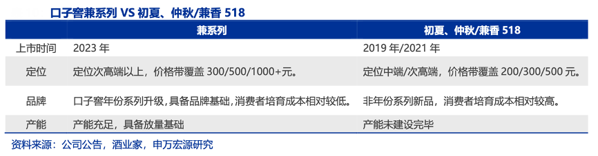 經(jīng)典案例:根據(jù)公司公告、酒業(yè)家、申萬(wàn)宏源研究等綜合資訊說(shuō)明,對(duì)比上一輪產(chǎn)品升級(jí),口子窖兼系列主要具備以下差異:兼系列在保留口子窖經(jīng)典元素的基礎(chǔ)上,對(duì)品質(zhì)、價(jià)格、包裝和品牌進(jìn)行多重升級(jí),提出“自然兼香,非同凡享”的全新廣告語(yǔ),突出品類優(yōu)勢(shì)。同時(shí),兼系列提價(jià)后兼 10/20/30 卡位 300/500/1000 元價(jià)格帶,契合安徽白酒向 300 元以上次高端升級(jí)趨勢(shì),而上輪產(chǎn)品升級(jí)時(shí)行業(yè)主流價(jià)格帶并未升級(jí)到次高端以上。