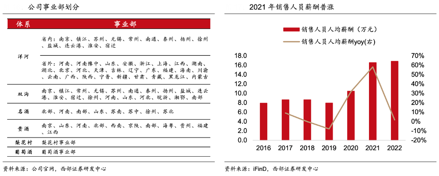 經典案例:根據公司官網、iFinD、西部證券研發中心等綜合資訊表明,洋河股份公司圍繞“營銷總部管總、事業部管戰”推動營銷組織架構調整,實現機構、責任下沉。現各部門分工明確互為配合,經營端分品牌設立組織單位,渠道端按不同品牌及區域劃分 80 個事業部,進行扁平化管理;公司注重營銷體系的建設,2021 年銷售人員薪酬普漲,并實行寬帶薪酬制度,加大薪酬方差調動基層員工積極性。