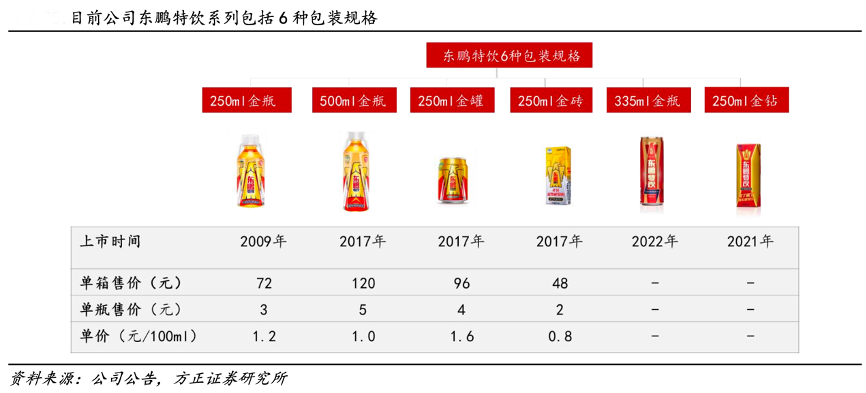 經(jīng)典案例:根據(jù)公司公告、方正證券研究所等綜合資訊表明,目前,東鵬特飲已經(jīng)有 6 種包裝規(guī)格,500ml 金瓶、250ml 金瓶、250ml 金罐、 335ml金罐、250ml 金磚和 250ml 金鉆。根據(jù)尼爾森 IQ 報告,2023 上半年東鵬特飲在中國能量飲料市場中銷售量占比由 2022 年的 36.7%提升至 40.86%,排名 保持第一;銷售額占比由 2022 年末的 26.62%提升至 29.06%,排名維持第二。