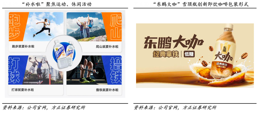 經(jīng)典案例:根據(jù)公司官網(wǎng)、方正證券研究所等綜合資訊表明,東鵬特飲公司在能量飲料大單品東鵬特飲之外,還有即飲咖啡、電解質(zhì)水、檸檬茶、涼茶 等品類,特別是近兩年陸續(xù)推出的“東鵬大咖”和“東鵬補水啦”,處于市場增 速較快即飲咖啡和運動飲料賽道,其中“補水啦”2023 年 1 月在廣東試點,4 月 推向全國市場,反響較好。