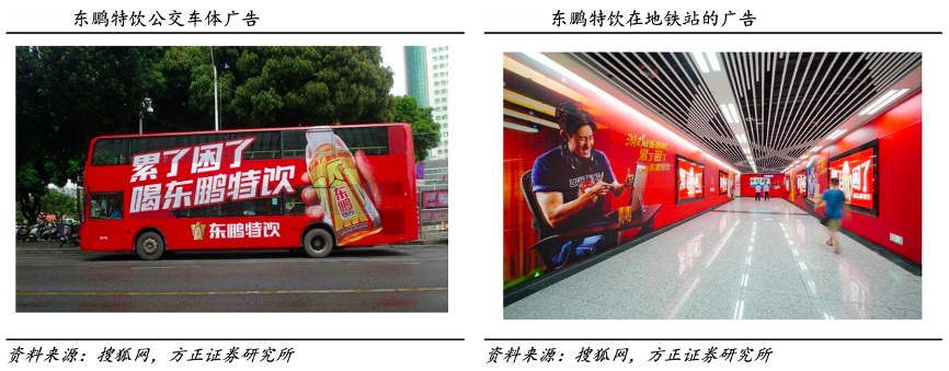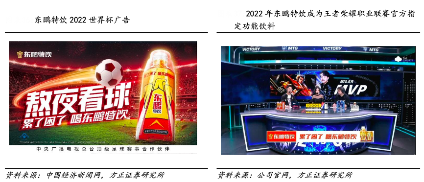 經典案例:根據公司官網、中國經濟新聞網、方正證券研究所等綜合資訊表明, 2018 年俄羅斯世界杯和 2022 年卡塔爾世界杯期間,公司兩度榮任央視總臺頂級足球賽事合作伙伴,能量飲料天然契合體育賽事,高效能投放快速擴大東鵬特飲品牌力,持續放大品牌聲量。此外,2022 年東鵬特飲成為王者榮耀職業聯賽官方指定功能飲料,在 217 個比賽日里以多方位的廣告形式將品牌植入賽事,著重深耕電競人群。