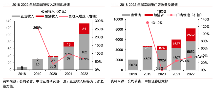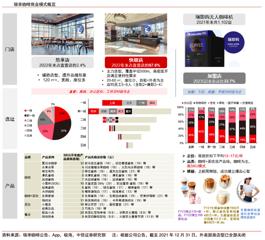 經(jīng)典案例:根據(jù)公司公告、中信證券研究部等綜合資訊表明,瑞幸咖啡公司業(yè)務通過直營店、加盟店和無人咖啡機展開,直營為主,加盟門店數(shù)量和收入占 比 2023Q2 提升至 34%和 24%。消費場景方面,外賣廚房完成開拓期使命后已如期關閉,當前快取店為主力,F(xiàn)Y22 末占比 97.6%,并設少量面積 120 平米+的悠享店輸出品牌形象。