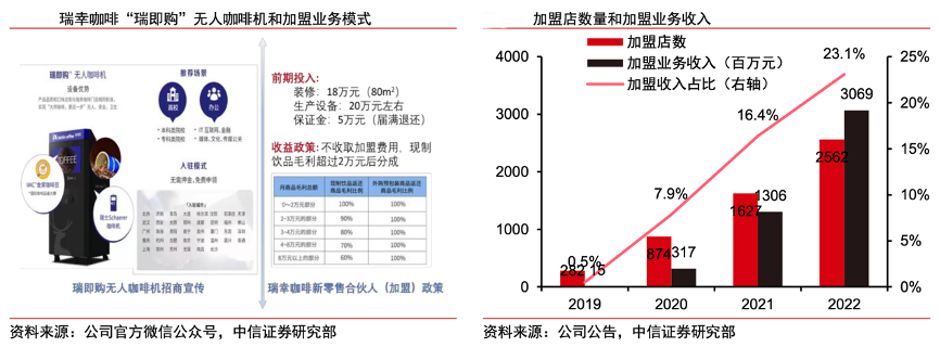 經典案例:根據公司官方微信公眾號、公司公告、中信證券研究部等綜合資訊表明,依托公司強大的中臺,瑞幸采用輕資產模式+新零售業務多線擴張,優化投入變現。公司通過加盟(聯營)這一相對輕資產的業務模式降低品牌擴張的資金壓力,同時提高供應鏈整體的產能利用率,優化品牌端和供應鏈端的投資收益水平。至 2022 年底,瑞幸咖啡加盟店共 2,562 家,占總門店數的 31%; FY2022 加盟貢獻收入 30.7 億元,占總收入的 23.1%。