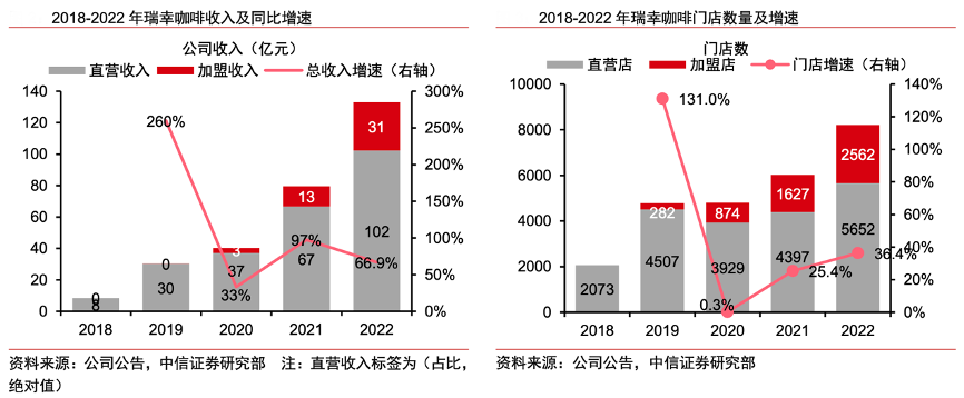 經(jīng)典案例:根據(jù)公司公告、中信證券研究部等綜合資訊表明,瑞幸咖啡公司 2022 年收入達(dá)到 133 億元、同比+66.9%,2018-22 年 CAGR 達(dá) 99%,快速開店和同店高增共同驅(qū)動收入強(qiáng)勢增長。FY2022 收入構(gòu)成上 77%來自直營門店、瑞即購等直營渠道銷售,23%來自加盟店。