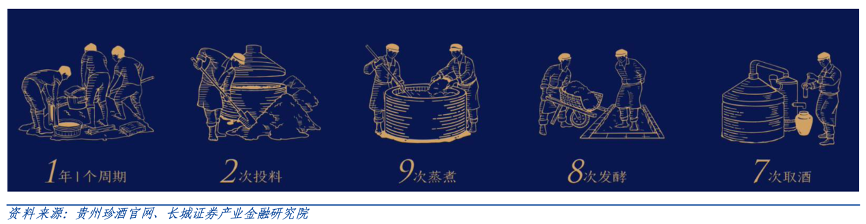 經典案例:根據貴州珍酒官網、長城證券產業金融研究院等綜合資訊表明,在釀造工藝 方面,珍酒堅守傳統大曲醬香釀造工藝和流程,約 11 個月一個周期,2 次投料,端午制曲,重陽下沙,9 次蒸煮,8 次發酵,7 次取酒,長期珍藏。一瓶珍酒的誕生,從釀造到 出廠銷售,至少要經過 5 年以上時光與歲月的沉淀。
