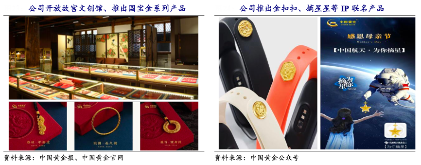 經(jīng)典案例:根據(jù)中國黃金報(bào)、中國黃金公眾號(hào)、中國黃金官網(wǎng)、開源證券研究所等綜合資訊表明,近年來國潮消費(fèi)在年輕一代中興起,中國黃金精準(zhǔn)定位年輕消費(fèi)群體,2022 年 3 月,中國黃金故宮文創(chuàng)館正式開放,作為重要的文創(chuàng)產(chǎn)品展銷、文化傳播平臺(tái),豐富了公司金飾產(chǎn)品的內(nèi)涵與表現(xiàn)手法,滿足人們對(duì)時(shí)尚、個(gè)性、設(shè)計(jì)感強(qiáng)的文化類黃金飾品需要。此外,公司還推出 IP 聯(lián)名產(chǎn)品,如與小米有品聯(lián)名推出金 扣扣、與中國航天基金會(huì)聯(lián)名推出摘星星系列產(chǎn)品等,不斷拓寬產(chǎn)品矩陣、開發(fā)高附加值產(chǎn)品,圈粉年輕消費(fèi)群體。
