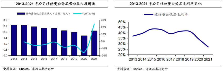 經典案例:根據Choice、海通證券研究所等綜合資訊表明,祖名公司植物蛋白飲品主要包括自立袋豆奶、利樂包豆奶、瓶裝豆乳等,2017-2021 年公司植物蛋白飲品營業收入由 2.30 億元下降至 2.09 億 元(CAGR=-2.37%)。2022H1,植物蛋白飲品實現營收 0.90 億元(YOY= -8.56%)。 2021 年,公司推出了高膳食纖維且保質期較長的“養自己”全豆豆乳系列,順應 低糖低脂、健康養生的飲品消費趨勢。