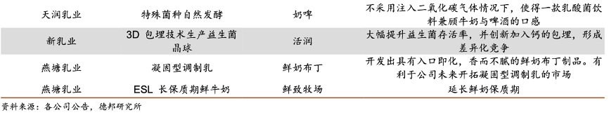 經典案例:根據各公司公告、德邦研究所等綜合資訊表明,天潤乳業運用特殊菌種發酵技術,生產出不注入二氧化碳氣體情況下,兼顧牛奶與啤酒口感的乳酸菌飲料奶啤,目前已成長為貢獻公司超 10%收入的高毛利大單品。新乳業將 3D 包埋技術生產的益生菌晶球加入活潤酸奶,大幅提升益生菌存活率,同時創新加入鈣的包埋,形成差異化競爭。
