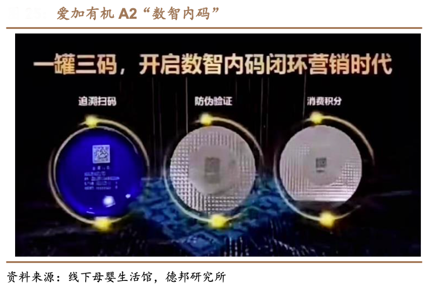 經典案例:根據線下母嬰生活館、德邦研究所等綜合資訊表明,貝因美新品愛加有機 A2 用“數 智內碼”由“追溯碼+防偽驗證碼+消費積分碼”共同組成,分別完成追蹤溯源、防偽驗證、消費積分三大功能。“數智內碼”可隨時查詢產品物流走向、銷售終端門店等信息,從而精準把控產品自出廠、運輸到銷售的每一個環節,用技術手 段杜絕竄貨,充分保障渠道端權益及利潤。
