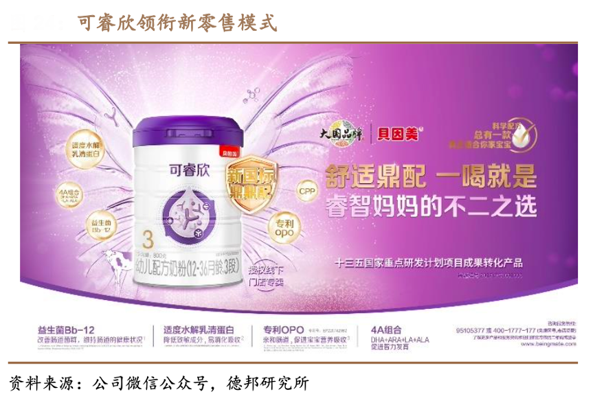 經典案例:根據公司微信公眾號、德邦研究所等綜合資訊表明,貝因美2021 年度重點打造了“可睿欣”嬰幼兒配方乳粉,具有親舒腸道的功能,產品力強,復購率高。該產品自上市以來便定位新零售模式。新零售模式通過實時跟蹤價值鏈各環節的數據信息和用戶信息,將前后臺數據打通融合,極大提高了整個價值鏈的運行效率; 同時按照人、貨、場的概念,精準匹配門店、商圈及目標客戶,精細運維賦能終端門店。截止2022 年 11 月,可睿欣已覆蓋超過 1 萬家門店。