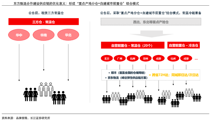 經(jīng)典案例:根據(jù)品牌官微、長江證券研究所等綜合資訊表明,東方甄選公司借助行業(yè)龍頭的能力為自營品建設(shè) 5 城 20 個前置倉,形成“重點產(chǎn)地分倉+自建成 時前置倉”結(jié)合的倉儲層次,并配置了了冷凍前置倉,為冷鏈產(chǎn)品發(fā)展打好基礎(chǔ);此外,順豐覆蓋全國的倉儲網(wǎng)絡(luò)、京東在購物街中打磨的彈性供應(yīng)鏈方案,都將賦能東方甄選產(chǎn)品發(fā)展。