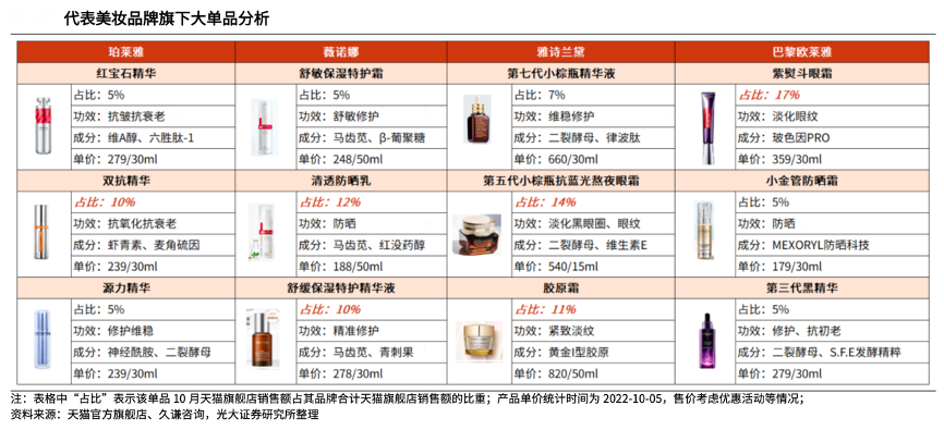 優(yōu)秀案例:根據(jù)天貓官方旗艦店、久謙咨詢、光大證券研究所等綜合資訊表明,雅詩(shī)蘭黛小棕瓶精華在1982~2020 年期間共迭代了七次,根據(jù)久謙咨詢數(shù)據(jù),2022 年 10 月小棕瓶精華為雅詩(shī)蘭黛天貓旗艦店貢獻(xiàn)了約7%的銷售額。一款優(yōu)秀的大單品擁有較長(zhǎng)的生命周期,能夠助力品牌的長(zhǎng)期成長(zhǎng),當(dāng)品牌的大單品贏得消費(fèi)者信賴之后,其他產(chǎn)品也更容易被市場(chǎng)接納。