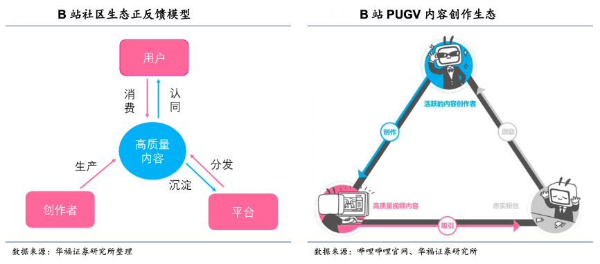 經典案例:根據嗶哩嗶哩官網、華福證券研究所等綜合資訊表明,雙邊平臺效應+社區共識強化,B 站以內容形成了增長飛輪。B 站的視頻內容并 不以傳統的影視綜藝為主,而是以 PUGV(Professional User Generated Video)為核心,即用戶自制的、經過專業策劃和制作的高質量視頻,PUGV 內容 B 站已經形成了“UP 主創作高質量視頻內容-高質量視頻內容吸引忠實粉絲-忠誠粉絲的正反饋 激勵 UP 主持續產出優質內容”的生態閉環。