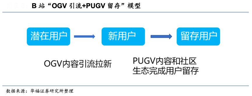 經典案例:根據嗶哩嗶哩財報、華福證券研究所等綜合資訊表明,B 站以優質 OGV 和 PUGV 內容作為生態聯結的核心動能。專業的 OGV 內 容吸引新用戶后,PUGV 內容所連接的強粘性用戶生態成為新用戶留存的主陣地。如B 站聯合迪士尼出品原 創律政主題劇集《正義的算法》,在影視區、娛樂區、知識區也衍生出不少 PUGV 二創內容。優質 OGV 內容對站外拉新產生了促進作用,接著根據用戶興趣愛好進行分 流,B 站豐富的 PUGV 內容和獨特的社區氛圍使得新用戶愿意留存下來。這樣“OGV 引流+PUGV 留存”的模式成為了 B 站特有的用戶增長優勢。