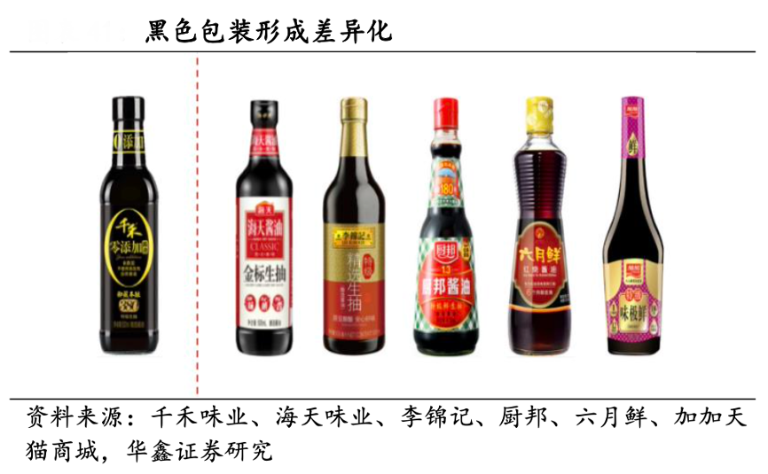 經(jīng)典案例:根據(jù)千禾味業(yè)、海天味業(yè)、李錦記、廚邦、六月鮮、加加天貓商城和華鑫證券研究等綜合資訊表明,千禾公司通過全新的黑色包裝也與其他品牌五顏六色的包裝形成差異化的產(chǎn)品形象,能夠在超市的商品展柜上一目了然。