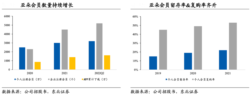 經典案例:根據公司招股書、東北證券等綜合資訊表明,亞朵通過 A-Card 會員計劃培養客戶忠誠度和粘性,會員基數快速增長,2016-2021年個人會員復合增速為 48.7%,30 歲以下注冊會員復合增速為 83.9%,截至 2022Q2 公司注冊個人會員數達 3200 萬。2019-2021 年公司會員留存率分別為 14.8%/19.4%/21.7%,復購率分別為44.6%/48.7%/52.8%,會員黏性持續提升, 打造私域流量蓄水池。