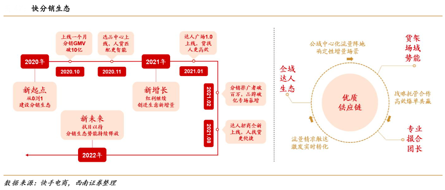 經(jīng)典案例:根據(jù)快手電商、西南證券等綜合資訊表明,2021 年 11 月 26 日,快手將官方電商優(yōu)選平臺(tái)好物聯(lián) 盟升級(jí)為快分銷,2021Q4,快手逾 30% 的電商交易總額來自快分銷??旆咒N供給能力的提升以及商家和達(dá)人匹配效率的提升,進(jìn)一 步推動(dòng)了快手電商業(yè)務(wù)的閉環(huán)建設(shè)。根據(jù) 2022 快手創(chuàng)作者大會(huì),22H1 快分銷 GMV 同比增長(zhǎng) 116%,達(dá)人推廣規(guī)模人數(shù)超 700 萬,累計(jì)商家數(shù)超 20 萬,分銷庫商品接近 9000 萬。