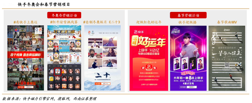 經(jīng)典案例:根據(jù)快手磁力引擎官網(wǎng)、搜狐網(wǎng)、西南證券等綜合資訊表明,2022 年初,快手推出了冬奧會(huì)和春節(jié)營銷兩大項(xiàng)目,通過豐富的創(chuàng)意展現(xiàn)了自身平臺(tái)的內(nèi)容營銷能力,冬奧會(huì)項(xiàng)目吸引的廣告主超 20 個(gè),包括中國移動(dòng)、聯(lián)想、三星、豐田中國、安踏、寶潔、加多寶、清揚(yáng)、勁酒、 紅牛、金領(lǐng)冠等,春節(jié)營銷活動(dòng)吸引廣告主超 10 個(gè),品牌總曝光 2946 億、品牌總漲粉 4651 萬,兩大活動(dòng)不僅幫助快手爭(zhēng)奪了 C 端流量,也在 B 端實(shí)現(xiàn)了品牌廣告的躍遷。