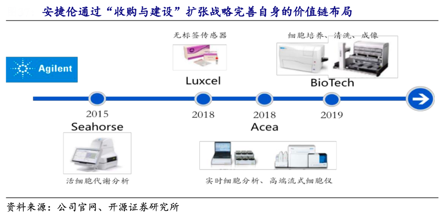 經典案例:根據公司官網、開源證券研究所等綜合資訊表明,安捷倫通過“收購與建設”的發展戰略,不斷完善自身的價值鏈布局、提升自己的全球影響力。2010年,安捷倫收購儀器制造公司 Varian, 增強了自身在化學分析儀器方面的業務深度,并正式進入生命科學領域,并通過對其核磁共振業務的整合成為全球三大核磁供應商。