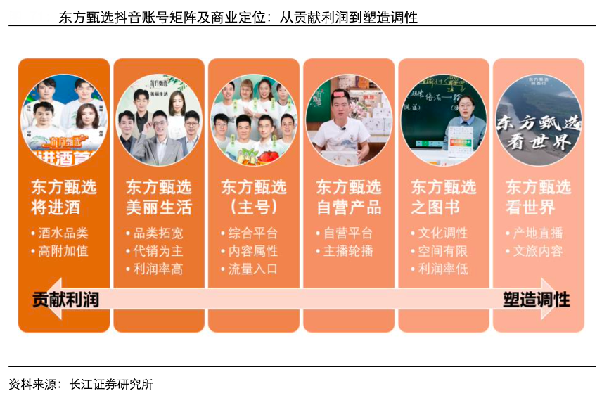 經典案例:根據長江證券研究所等綜合資訊表明,“東方甄選”品牌目前下設 7 個抖音直播間,組合構成公司戰略的目標利潤率與調性風格平衡。大體來說,貢獻利潤的是將進酒、美麗生活兩個賬號,代銷傭金將直接確認為收入;塑造調性的是看世界、圖書兩個賬號,執行創始人推崇的“讀萬卷書,行千里路” 理念,但品類天花板與利潤率水平相對低;主號享受最大的流量基礎,作為綜合平臺兼 顧商業與文化雙重屬性,為其他矩陣號宣傳引流。