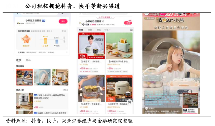 經典案例:根據抖音、快手、興業證券經濟與金融研究院等綜合資訊表明,近年抖音、快手等新興渠道崛起,小熊公司緊跟時勢開始積極布局,在抖音、快手等平臺商設置旗艦店,截至 2022 年 11 月,抖音平臺小熊 電器官方旗艦店已擁有 165 萬粉絲,獲贊 83w。