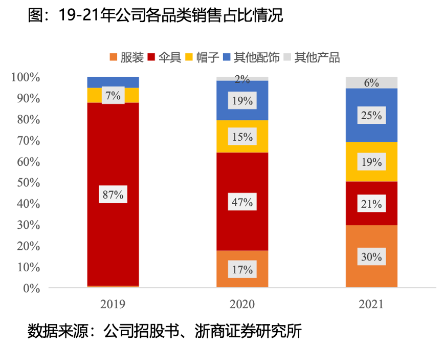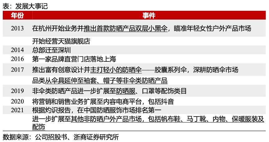 經典案例:根據公司招股書、浙商證券研究所等綜合資訊表明,蕉下公司產品矩陣的打造從帽子到鞋履,以消費者戶外運動全身裝備為起點,滿足消費者多場景戶外運動需求。目前22款單品年銷售超3000萬,3款為17年及以前推出的防曬傘, 19-21年期間推出19款(5款21年推出,分別為墨鏡、傘、帆布鞋、打底褲、馬丁靴)。