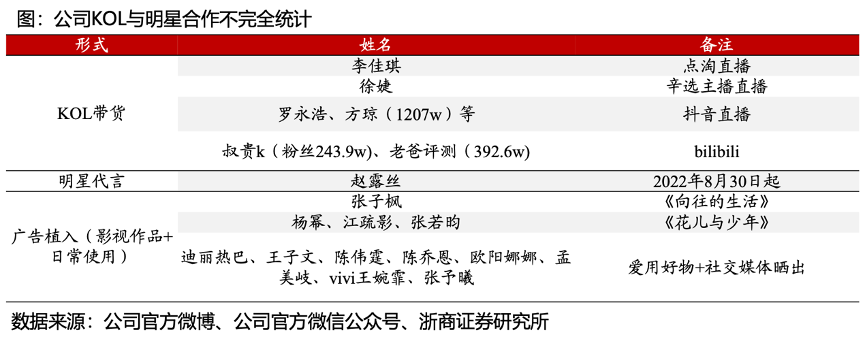 經典案例:根據公司官方微博、公司官方微信公眾號、浙商證券研究所等綜合資訊表明,蕉下擅長通過KOL組合投放+明星代言營造產品高話題度,21年合作超600位KOL(199位粉絲超百萬,除合作包括李佳琦、羅永浩在內的頂級頭部KOL外,亦包括大量中腰部KOL)。間接影響14億粉絲,帶來超45億瀏覽量。