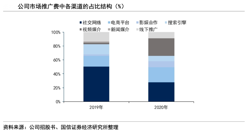 經典案例:根據(jù)公司招股書、國信證券經濟研究所等綜合資訊表明,迪阿股份公司積極把握短視頻風口,加大了在抖音、快手等短視頻渠道的投入,2020 年視頻媒介推廣費投入大幅增長 990.53%,投入占比從 2019 年的僅2.29%大幅提升至 25.16%。