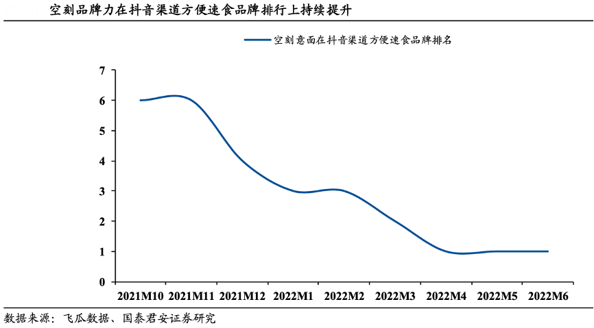 經(jīng)典案例:根據(jù)飛瓜數(shù)據(jù)、國泰君安證券研究等綜合資訊表明,高端方便主食消費者以 Z 時代、精致媽媽、資深中產(chǎn)為主,因此針對潛在受眾,空刻公司以“海陸空式”立體化投放(直播 帶貨/KOL 種草/梯媒廣告/電視劇廣告植入等)進行品牌宣傳,配合產(chǎn)品/渠道力的同步發(fā)力,空刻品牌影響力持續(xù)提升,其在抖音渠道方便速食品牌排行榜上從 2021 年 10 月的第 6 名持續(xù)進步至 2022 年 3 月的第 2 名,并從 2022 年 4 月開始穩(wěn)居第1名。