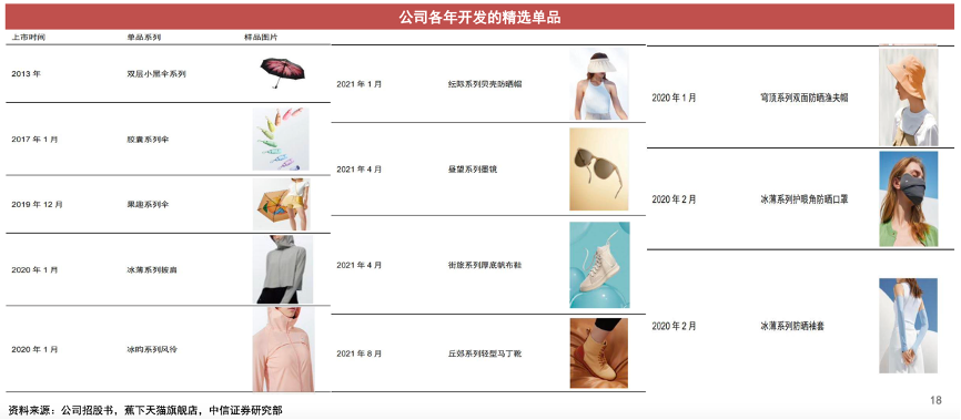 經(jīng)典案例:根據(jù)公司招股書、蕉下天貓旗艦店、中信證券研究部等綜合資訊表明,蕉下打造爆款防曬傘成功入圍,產(chǎn)品設(shè)計(jì)直擊消費(fèi)者痛點(diǎn)。公司開發(fā)的傘具富有“高顏值、科技感拉滿、隨身攜帶”等特征,截至2022年4月,公司有22款精選單品年銷售額超過3000萬元。
