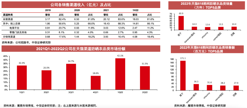 經(jīng)典案例:根據(jù)公司招股書、魔鏡市場情報(bào)、中信證券研究部等綜合資訊表明,蕉下電商起盤,線上渠道表現(xiàn)優(yōu)異,公司攜手頭部主播直播帶貨刺激消費(fèi)(僅2021年618期間李佳琦直播間14次)。根據(jù)魔鏡市場情報(bào)數(shù)據(jù),公司在2022年618期間(2022年6月1日-6月20日)防曬衣品類累計(jì)銷量達(dá)60.9萬件,銷售額達(dá)1.71億元,領(lǐng)先第二名約4倍。