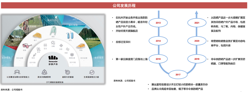 經典案例:根據公司招股書、中信證券研究部等綜合資訊表明,蕉下是中國防曬服飾龍頭品牌,公司早期以防曬傘為起點,產品矩陣逐漸擴展至防曬服飾全品類。公司在中國防曬服飾中市場占有率達5%(線上市占率達13%),位居防曬服飾品牌第一。