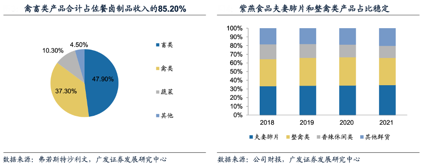 經典案例:根據弗若斯特沙利文、公司財報、廣發證券發展研究中心等綜合資訊表明,經過長期消費者培育和市場篩選,佐餐鹵制品形成了夫妻肺片、鹵牛肉、整禽類、豬蹄等核心產品,產品結構相對穩定,單品迭代慢。參考大眾點評產品熱度排行,夫妻肺片、禽類、醬牛肉等產品在多個代表性品牌熱門產品中位居前列。以紫燕食品為例,成熟大單品夫妻肺片、百味雞、藤椒雞等占比穩定,2018-2021年夫妻肺片占鮮貨類收入比重分別為33.50%/34.03%/34.31%/34.74%。