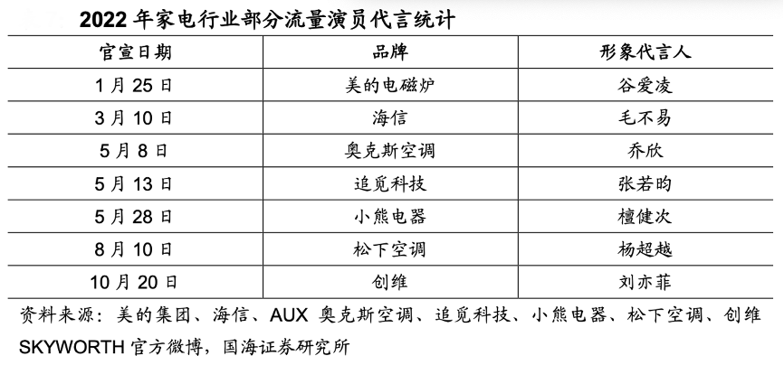 經典案例:根據美的集團、海信、AUX奧克斯空調、追覓科技、小熊電器、松下空調、創維SKYWORTH官方微博、國海證券研究所等綜合資訊表明,企業可利用代言人的形象強化品牌“科技智能、 年輕時尚”的標簽,為吸引更多年輕群體打下基礎。2022 年 5 月追覓科技宣布 張若昀為品牌代言人,公司于 2022 年 5 月 31 日晚 8 點至6 月 18 日晚上 23 點 59 分期間全渠道銷售戰績突破 4 億元,同比增長 900%。