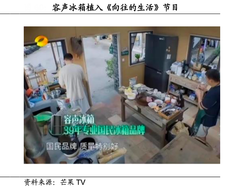 經典案例:根據芒果TV、國海證券研究所等綜合資訊表明,結合2022 年京東大數據顯示,2021 年 1 月至 2022 年 1 月京東線上洗衣機營銷方式中 IP 聯名、明星同款分別占比27%、16%,年輕流量帶動消費已有所成效。2022Q3 容聲贊助的綜藝《向往的生活》熱播,容聲冰箱產品植入蘑菇屋,節目期間容聲冰箱與節目相關話題閱讀量超過 1 億、視頻播放量達到 2.7 億,超百萬人參與互動,帶動容聲 冰箱 2022Q3 營收增長 27%。