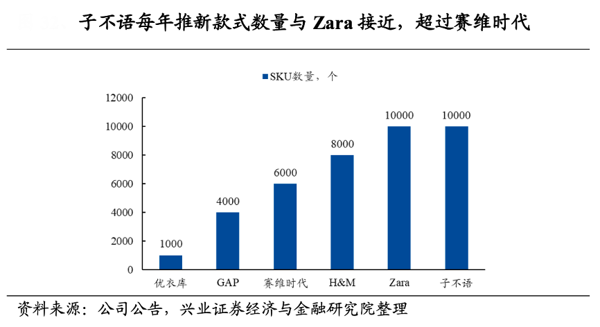 經(jīng)典案例:根據(jù)公司公告、興業(yè)證券經(jīng)濟(jì)與金融研究院等綜合資訊表明,實(shí)力雄厚的 設(shè)計(jì)團(tuán)隊(duì),基于強(qiáng)力的大數(shù)據(jù)分析能力以及超 12 萬個樣本的產(chǎn)品設(shè)計(jì)數(shù)據(jù)庫, 保持了快速且高質(zhì)的推新節(jié)奏+持續(xù)且豐富的產(chǎn)品迭代,使得子不語持續(xù)能成功打造出高銷量+久周期的爆款產(chǎn)品系列。子不語堅(jiān)持自主設(shè)計(jì),90%以上產(chǎn)品均為自主設(shè)計(jì),子不語每年能夠設(shè)計(jì)并推出超 1 萬種新服裝款式,與 Zara 接近,已超過同類跨境電商公司賽維時(shí)代約 6000 款年推新數(shù)量。
