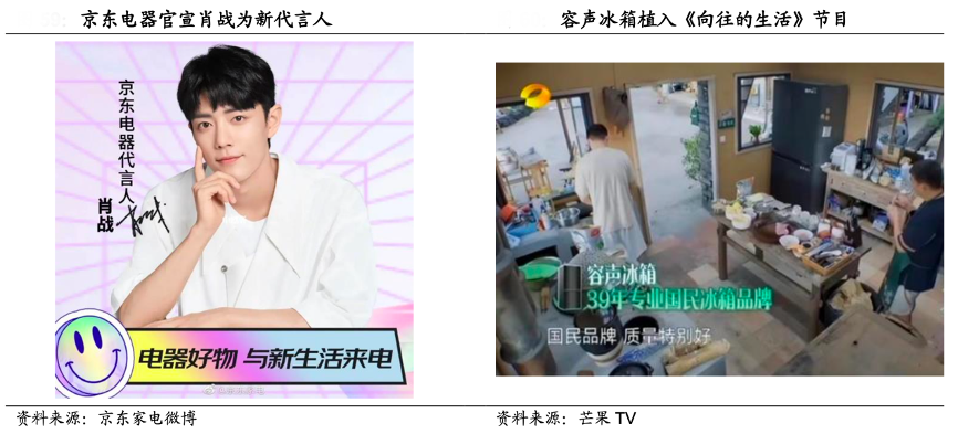 經典案例:根據京東家電微博、芒果TV、國海證券研究部等綜合資訊表明,結合2022 年京東大數據 顯示,2021 年 1 月至 2022 年 1 月京東線上洗衣機營銷方式中 IP 聯名、明星同 款分別占比 27%、16%,年輕流量帶動消費已有所成效。2022Q3 容聲贊助的綜 藝《向往的生活》熱播,容聲冰箱產品植入蘑菇屋,節目期間容聲冰箱與節目相關話題閱讀量超過1億、視頻播放量達到 2.7 億,超百萬人參與互動,帶動容聲冰箱 2022Q3 營收增長27%。