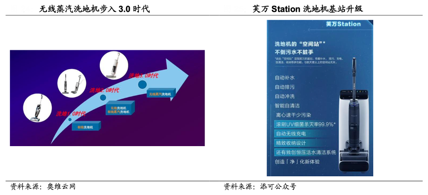 經典案例:根據奧維云網、添可公眾號、國海證券研究所等綜合資訊表明,無線蒸汽洗地機開啟行業 3.0 時代,基站自動化升級解決清洗痛點。2022 年 8 月安克創新子品牌悠飛馬赫推出無線蒸汽洗地機 V1 Ultra, 隨后追覓推出 T12,添可推出芙萬 Steam2.0,實現高溫清潔除菌,針對性解決養寵一族、重度清潔愛者、精致寶媽等核心用戶需求。