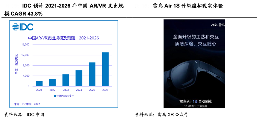 經典案例:根據IDC中國、雷鳥XR公眾號、國海證券研究所等綜合資訊表明,從 AR 眼鏡到 VR 一體機再到 XR 視頻直播平臺建設,黑電企業積累底層技術支持元宇宙形態。TCL 電子孵化雷鳥創新專注 AR 領域,2022 年 4 月雷鳥上市定位于消費級娛樂大屏智能眼鏡產品雷鳥Air,后與元宇宙工具平臺 720 云達成戰略合作,圍繞 XR 內容生態建設展開合作,10月發布雷鳥 Air 眼鏡的升級版 Air 1S。2022年“雙 11”期間雷鳥 AR 眼鏡在天貓+京東雙平臺 AR 品類總銷量/總銷額雙第一, 銷售額環比 618 全周期提升484%。