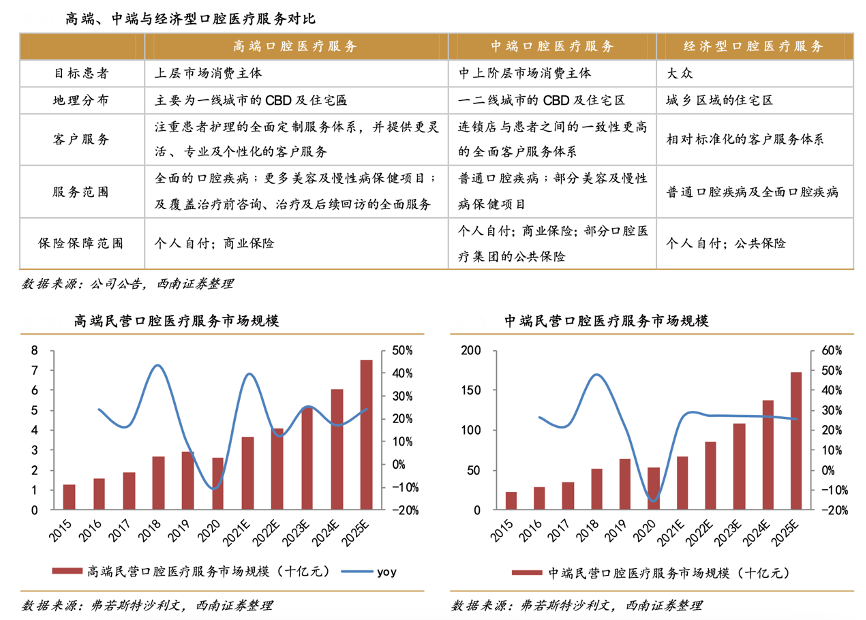經典案例:根據公司公告、弗若斯特沙利文、西南證券等綜合資訊表明,高端口腔醫療服務以更高的醫療標準與更佳的服務設施與私密度滿足成熟消費者的期望。中端口腔醫療服務提供商通常以連鎖店的形式提供服務,能夠搭建全面 客戶服務體系。高端民營口腔醫療服務市場在 2012 年為 12.9 億元,根據 沙利文預測,將于 2025 年達到 74.9 億元,CAGR 達 14.5%。