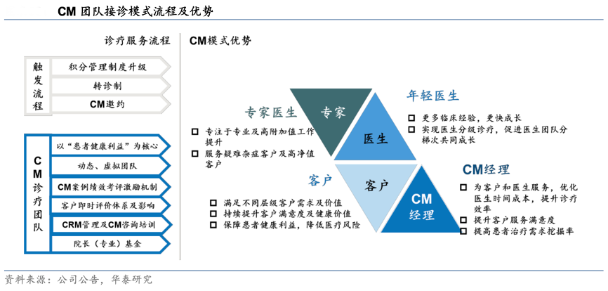 經典案例:根據公司公告、華泰研究等綜合資訊表明,通策醫療公司以醫生為核心生產力進行資源配置,積極推行以患者為中心的 CM(Case Manager)團隊接診模式,通過分工將醫生時間更多分配至專業化程序,以實現分類管理、精準服務的效果。