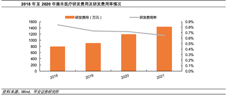 經典案例:根據wind、平安證券研究所等綜合資訊表明,雍禾醫療重視研發,力求通過不斷提高自身能力,來提升客戶的用戶體驗。2007年,公司率先引進FUE植發技術,推動中國植發行業的技術變革。公司目前持有八項醫療技術發明專利,這些技術進一步提高了手術的安全性和品質。2018年至 2021 年,公司的研發費用(781/887/1181/1416 萬元)不斷增加,研發費用率( 0.84%/ 0.73%/0.72%/0.65%)略有下滑穩定。