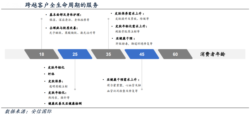 經典案例:根據安信國際等綜合資訊表明,美麗田園公司主營傳統美容服務業務,自 2011 年起進軍醫療美容服務,打開第二條成長曲線,2018年開始發展亞健康評估及干預服務,開拓未來增長的第三大支柱。公司提供多樣化美麗與 健康管理服務,涵蓋 47 類服務項目及超過 800 個 SKU,跨越客戶全生命周期。
