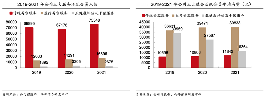 經(jīng)典案例:根據(jù)公司招股書、西部證券研發(fā)中心等綜合資訊表明,高客流量及出色的運(yùn)營使美麗田園公司得以建立龐大的會員庫,并且活躍會員人數(shù)龐大,消費(fèi)能力高且粘性較高。2019年、2020年及2021年,公司活躍會員中的 80.7%、82.1%及 84.6%分別于當(dāng)年多次購買了公司服務(wù)。按活躍會員平均消費(fèi)來看,公司傳統(tǒng)美容服務(wù)的活躍會員平均消費(fèi)金額超過 1 萬元,醫(yī)療美容服務(wù)活躍會員平均消費(fèi)金額接近 4 萬元,均在業(yè)內(nèi)處于較高水平。