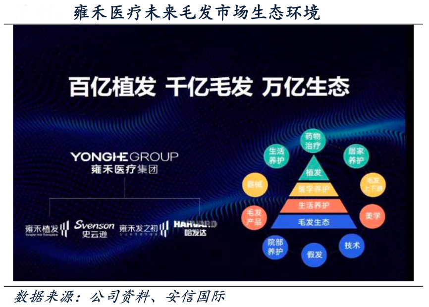 經典案例:根據公司資料、安信國際等綜合資訊表明,雍禾醫療公司主打“雍禾植發+史云遜+雍禾發之初+哈發達”四大品牌,打造全方位一站式毛發醫療 服務行業領先地位。其中,雍禾植發品牌以做植發手術為主,近幾年接受公司植發手術的患者人數快速增長,從 2018 年的 3.5 萬人增長至 2021 年的 5.8 萬人,CAGR 達 18.45%; 史云遜主營業務為醫療養固服務。