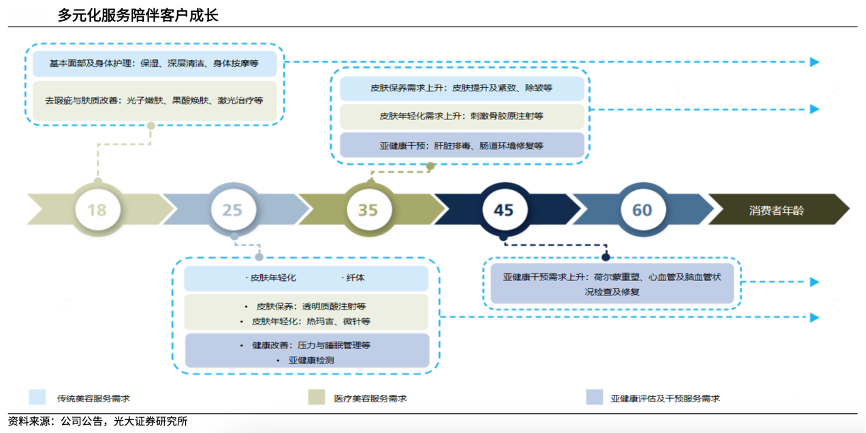 經典案例:根據公司公告、光大證券研究所等綜合資訊表明,美麗田園以“雙美”模式打造流量閉環,私域轉介降低銷售費用。其通過傳統美容服務初步贏得客戶信任,進而延伸至醫療美容服務以及亞健康評估及干預服務等服務, 多元化服務涵蓋 47 類服務項目及超過 800 個 SKU,陪伴客戶的成長。