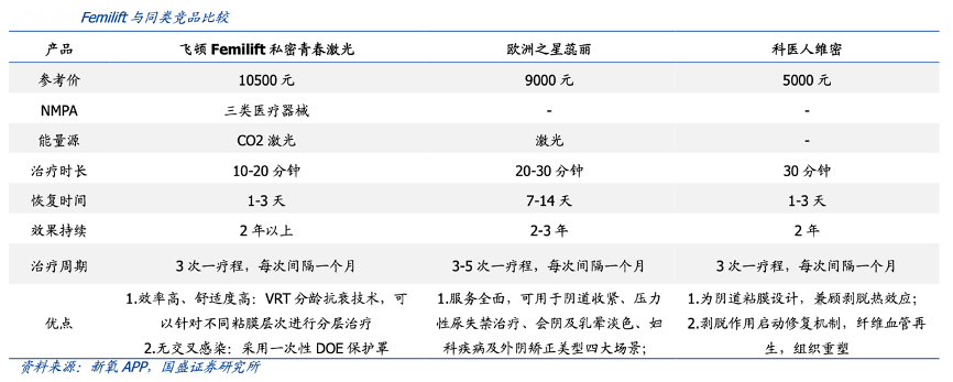 經(jīng)典案例:根據(jù)新氧APP、國(guó)盛證券研究所等綜合資訊表明,復(fù)銳醫(yī)療科技公司微創(chuàng)美容市場(chǎng)產(chǎn)品覆蓋多個(gè)領(lǐng)域,具體包括女性私密美容、抽脂、靜脈曲張治療。產(chǎn)品包括 FemiLift、BeautiFill by LipoLife 和 VascuLife。FemiLift 產(chǎn)品運(yùn)用 CO2 激光進(jìn)行女性私密健康修復(fù)治療,針對(duì)包括應(yīng)激性尿失禁、私密美容治療、產(chǎn)后修復(fù)、更年期后泌尿道綜合癥等問題。