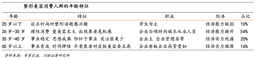 經典案例:根據專家交流、川財證券研究所等綜合資訊表明,26—35 歲因為有經濟基礎,對個人的生活品質要求在逐漸提高,這類人群對美容整形的需求最大,可以達到 54%,整形美容行業出現年輕化趨勢;另外就是 35—40 歲這個群體,因為事業穩定,思想比較成熟,但是年齡的壓力促使這個群體對美容行業的需求非常旺盛。