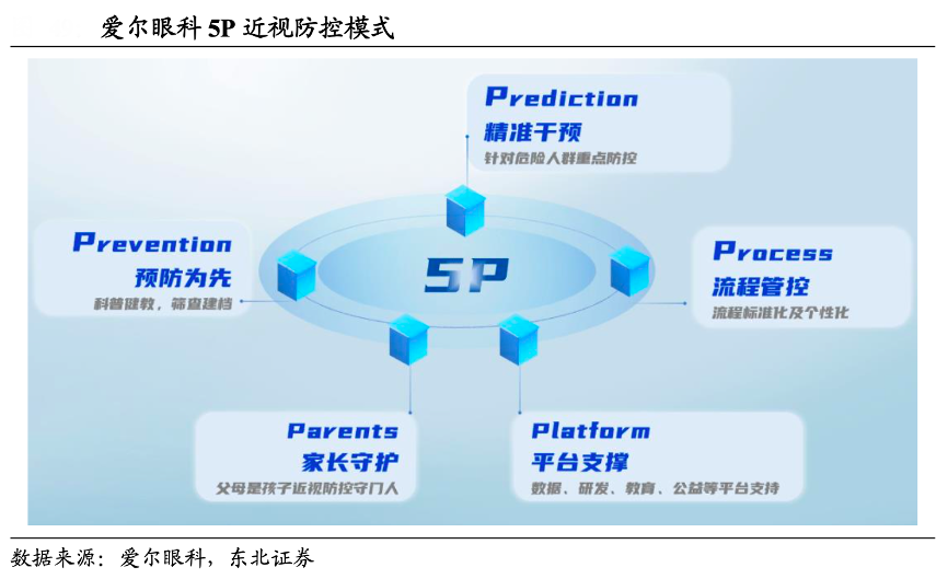 經(jīng)典案例:根據(jù)愛(ài)爾眼科、東北證券等綜合資訊表明,為進(jìn)一步完善近視防控綜合診斷標(biāo)準(zhǔn),滿足患者個(gè)性化需求,愛(ài)爾眼科于 2021 年成立了青少年近視眼防控門診,并以“5P 近視防控模式”為核心,充分依托學(xué)科專家、診療技術(shù)和服務(wù)等優(yōu)勢(shì),為中國(guó)兒童青少年精心制定“預(yù)防建檔+科學(xué)預(yù)測(cè)+控制干預(yù)+科普教育”一站式個(gè)性化診療方案。