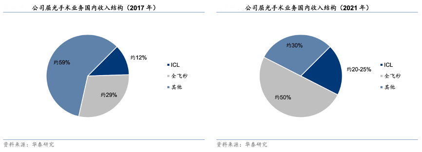 經(jīng)典案例:根據(jù)華泰研究等綜合資訊表明,隨著患者對(duì)于屈光手術(shù)術(shù)中治療便捷性和術(shù)后恢復(fù)舒適性的不斷追求,疊加患者支付能力的持續(xù)提升,愛爾眼科公司全飛秒及 ICL 等高端術(shù)式在屈光業(yè)務(wù)收入中的占比逐漸提升。根據(jù)相關(guān)調(diào)研,公司 21 年國(guó)內(nèi)全飛秒及 ICL 手術(shù)收入占國(guó)內(nèi)屈光業(yè)務(wù)收入比重已分別至約 50%及約 20-25%。